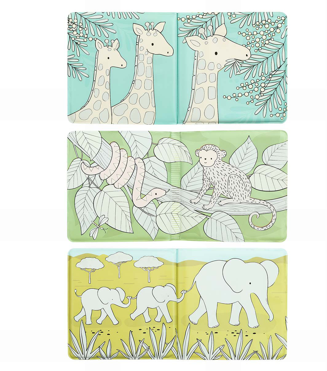 Zauberhaftes Badebüchlein mit 6 Seiten zum Gebrauch beim Baden. Die weichen, linierten Seiten sind wasserfest und voller niedlicher Savannentiere. Die Farben des Badebüchleins entstehen bei Kontakt mit dem Wasser. Das zauberhafte Badebuch lässt sich auch am Tisch mit einem nassen Pinsel ausmalen.