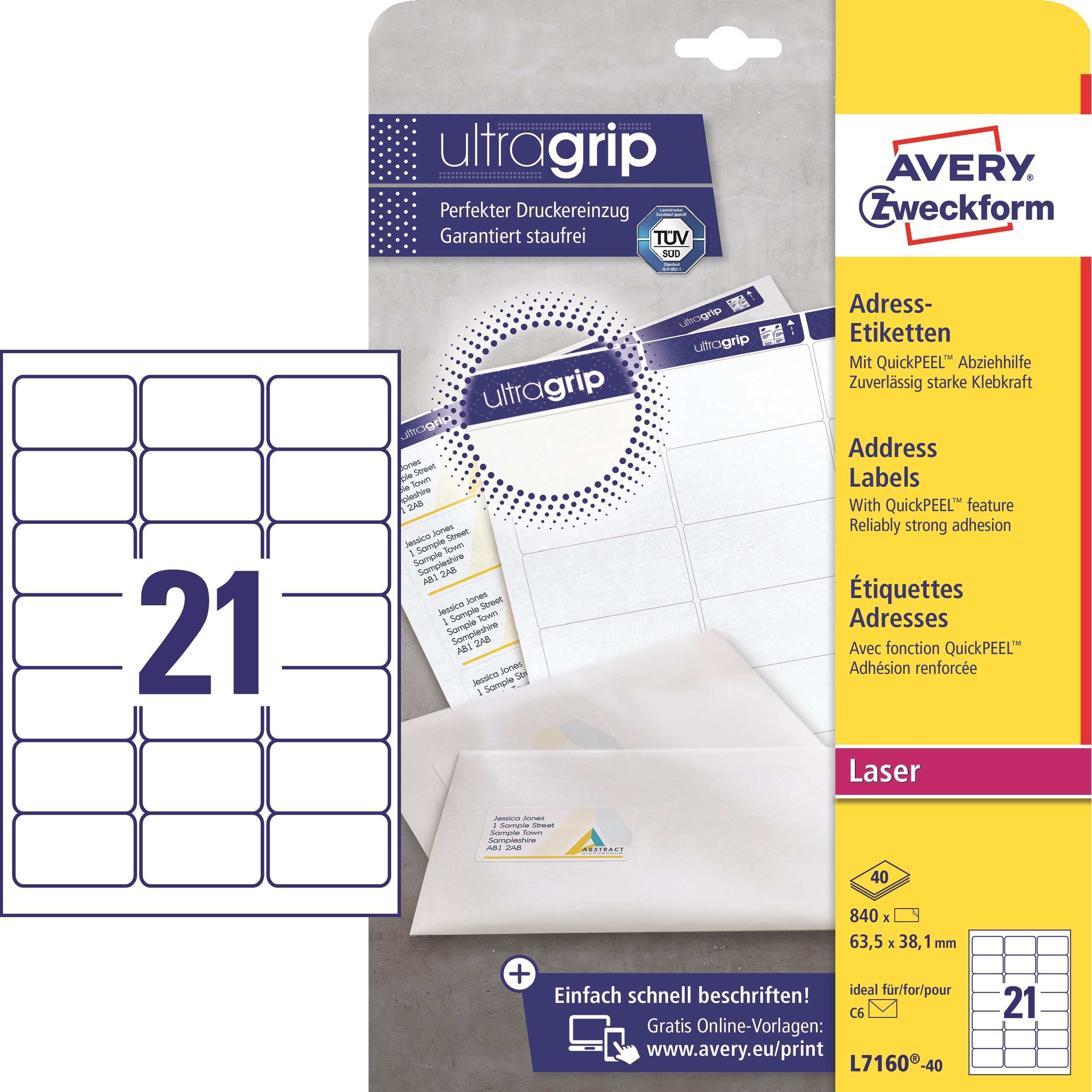 Produktinformationen "AVERY ZWECKFORM Adressetiketten 63.5x38.1mm L7160-40 weiss 840 Stk./40 Blatt"