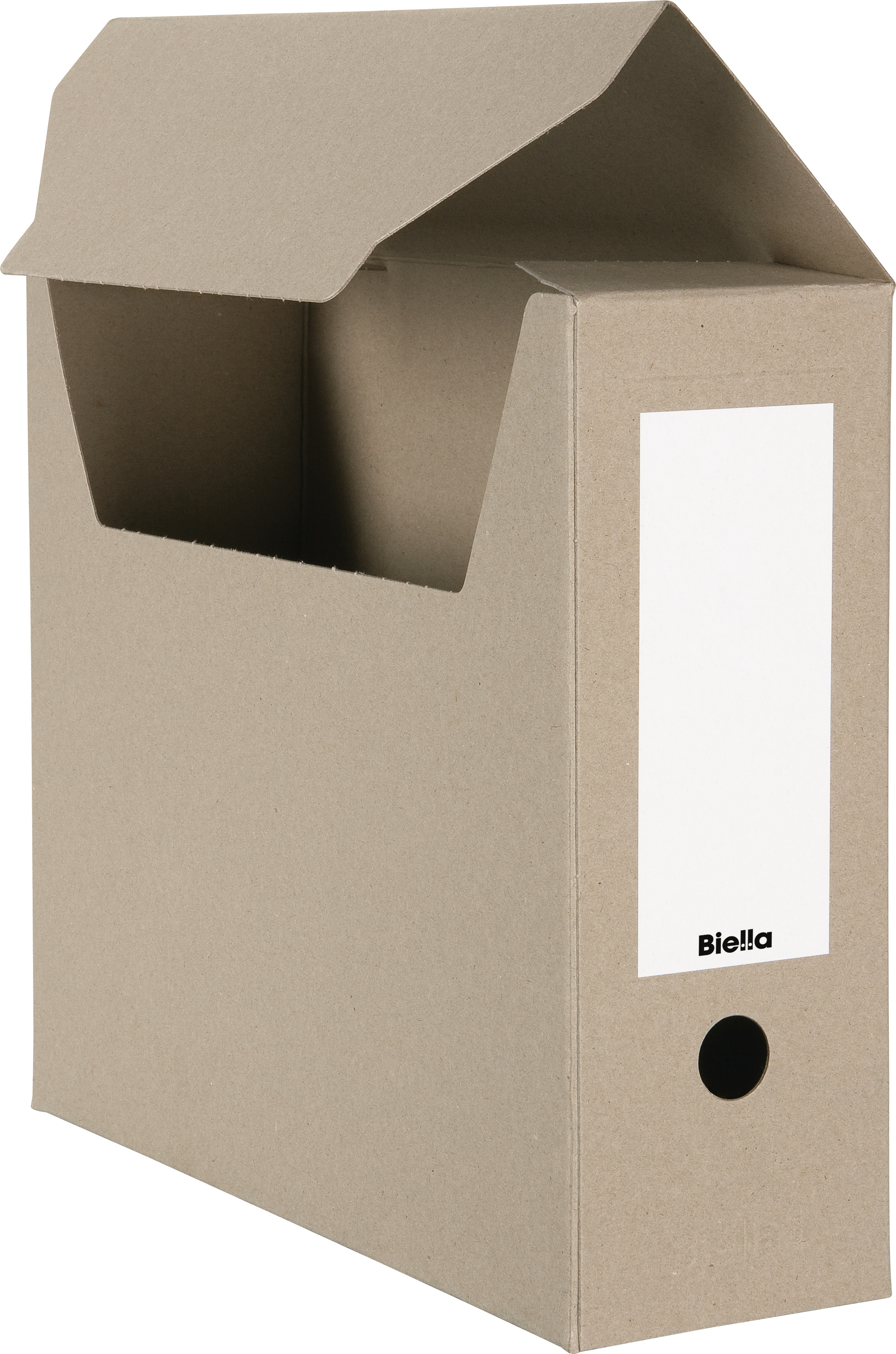 Biella Archivschachteln aus stabilem und trotzdem leichtem, braunem Karton für die Archivierung ihrer Unterlagen. Mit selbstklebendem Rückenschild für die individuelle Beschriftung. Mit praktischem Griffloch.