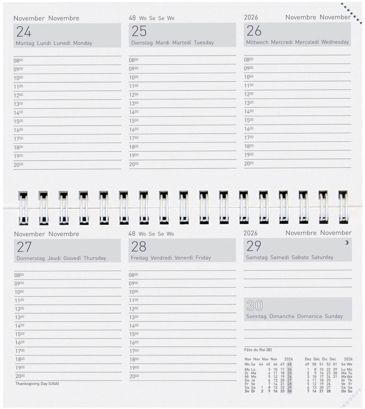 - jede Seite mit Monatsübersicht und Eckenperforation