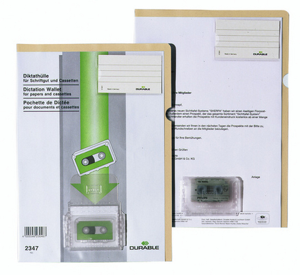 Eine Diktathülle von Durable ist für alle handelsüblichen Diktatkassetten, mit Beschriftungsfenster auf Vorderdeckel.