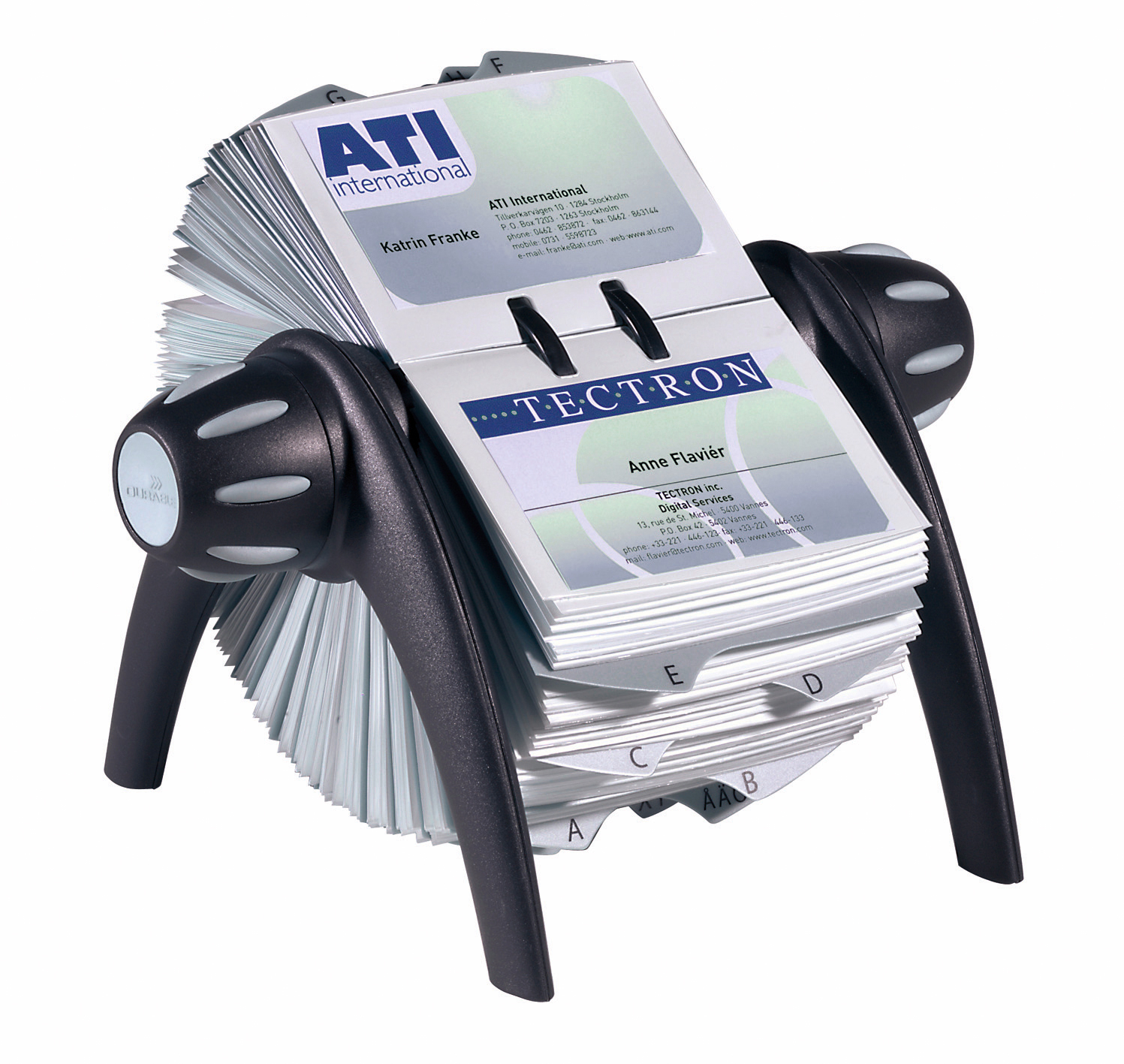 Rotationskartei für die Archivierung von Visitenkarten. Aus hochwertigem Kunststoff in exklusivem Design. Mit 200 Visitenkartenhüllen im Format 72 x 104 mm, beidseitig nutzbar, für 400 Visitenkarten. Alphabetisches, 25-teiliges Register von A–Z. Rationelles Bestücken der Hüllen mit Visitenkarten durch leichtes Entnehmen und Einstecken der Visitenkartenhüllen.