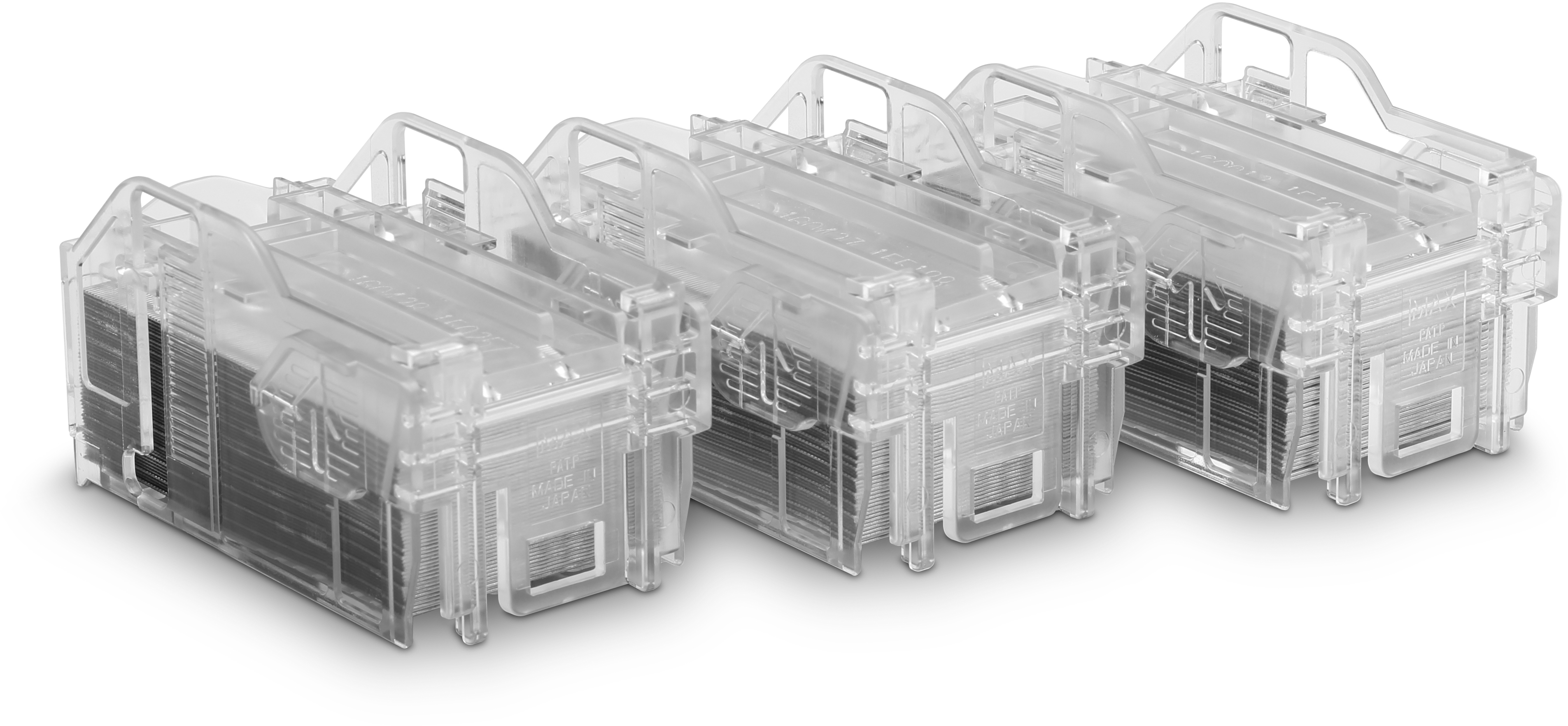 Vermeiden Sie Arbeitsunterbrechungen. Dank einer Füllung von 5.000 Heftklammern pro Kassette, drei Kassetten pro Paket und Meldungen über den noch vorhandenen Vorrat an Heftklammern gehen Ihnen die Heftklammern nie wieder mitten in einem Druckauftrag aus.