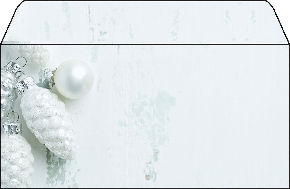 Weihnachts-Umschlag "Modern Christmas" mit Weihnachtsdeko in weiss und silber, passend zum Weihnachts-Motiv-Papier DP132. Die gummierten Umschläge ohne Fenster sind für die Beschriftung mit Inkjet- und Laser-Drucker sowie Kopierer geeignet. Im Lieferumfang sind 50 Stück im Format DIN lang enthalten.