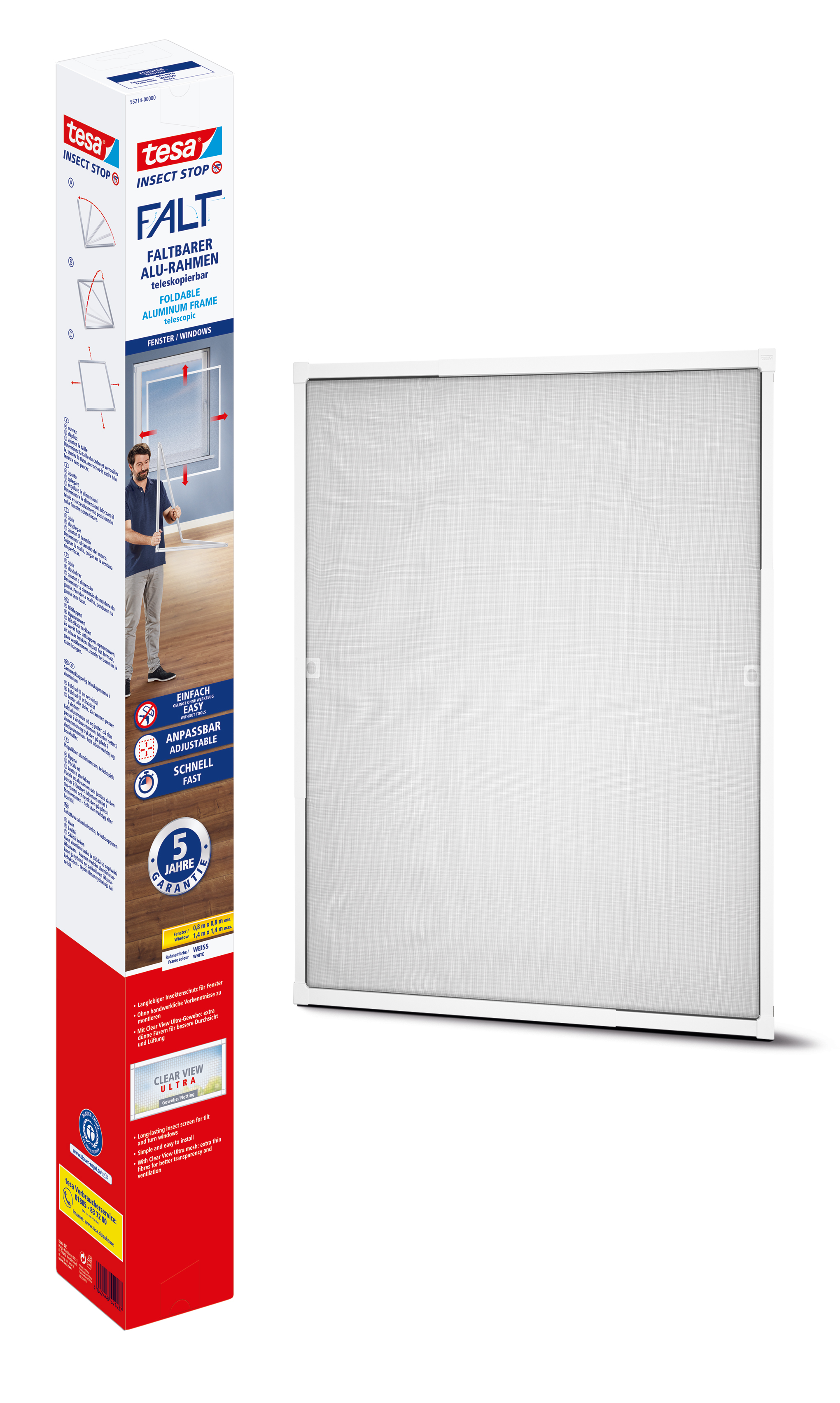 tesa® Insect Stop FALT - faltbarer Alu-Rahmen, teleskopierbar ist die langfristige Lösung, wenn es um Insektenschutz geht. Er ist das am einfachsten zu montierende und zudem frei einstellbare tesa® Fliegengitter für Fenster. Deshalb wird ausser einer Schere für die Montage nichts benötigt. Nur vier Montage-Schritte für das Fliegengitter ohne Bohren: 1. Rahmen entfalten 2. Teleskopprofile auf Mass schieben & fixieren 3. das Netz einpassen 4. Insektenschutz ins Fenster einhängen – fertig! Zudem sorgt das Clear View Ultra-Gewebe des tesa® Fliegengitters für bessere Durchsicht und Belüftung.